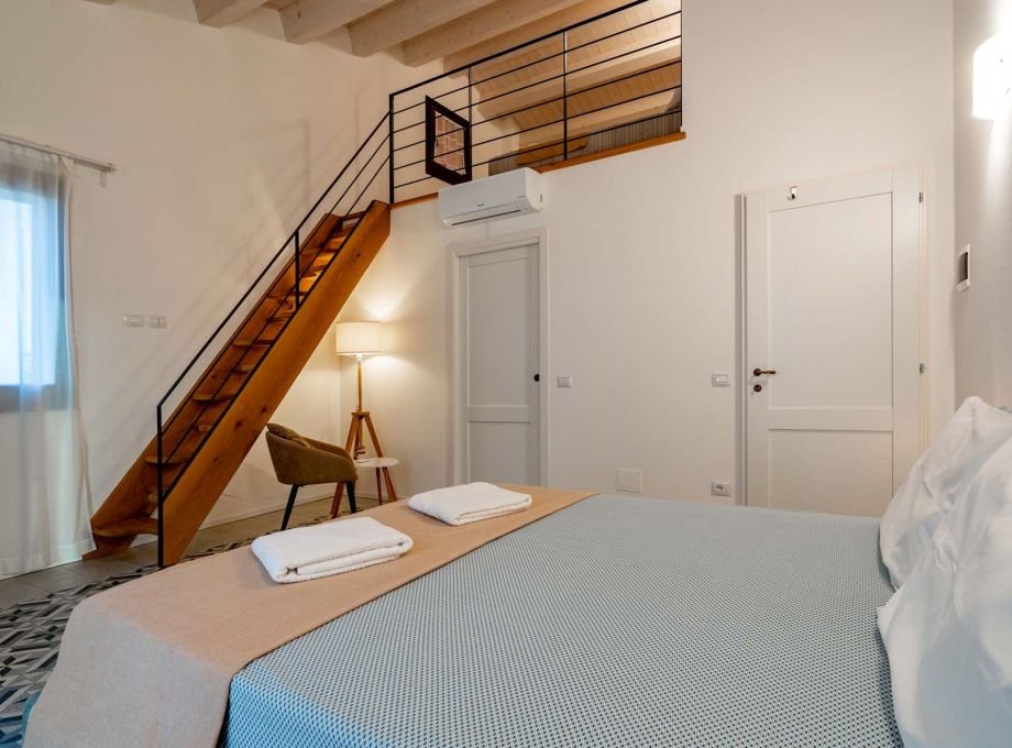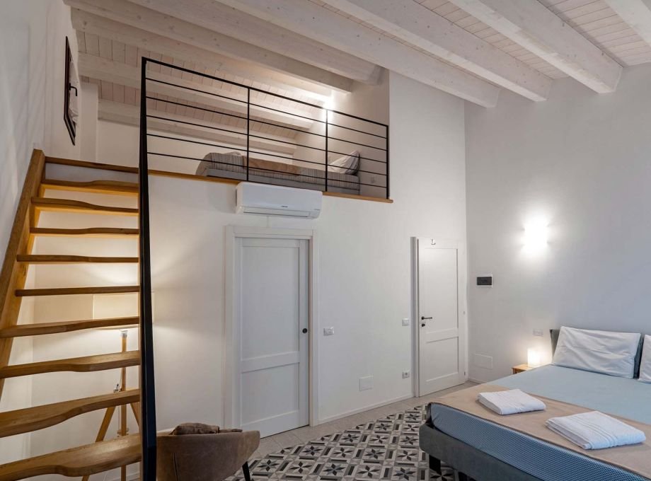 Una camera con letto matrimoniale, soppalco con due letti singoli, bagno privato con doccia e accesso alla terrazza.